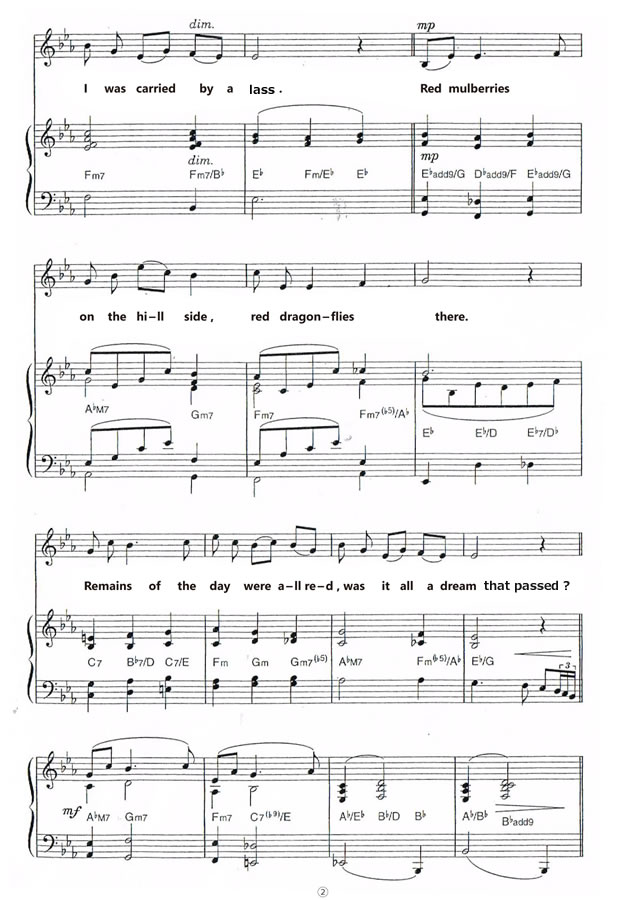 This month’s song is called “Aka-Tombo”, meaning “Red Dragonfly”. This song may well be a song every Japanese, young and old, is familiar with from his/her school days. The song depicts the memory of tender loving days from one’s childhood, especially for those who were brought up and taught in local districts, before those places, too, became urbanized with concrete buildings and highways as the economy developed and advanced. There were rivers and dells, and hills and dunes, and woods and trees, all untouched by industries, and all those little animals and flowers and fruits were near around, not like today when you can have a chance of getting access to them only at zoos, man-made gardens and supermarkets. “Akatombo”, or red dragonfly, was particularly near at hand when you were small and growing up in the countryside, and Mr. Rofu Miki, a poet from a small town, Tatsuno, in Hyogo Pref., in western Japan, wrote a poem which incites kind nostalgia of bygone days, and Mr. Kosaku Yamada, impressed by the heart-warming lyrics, gave a tune to it. The song was born in the early part of 20th century, and it is still taught at school and sung by many children and adults alike. I gave the song English lyrics in my hope of relaying even a faint atmosphere of old Japan in its simplest and purest environments that existed - relaying to people living overseas, but having curiosity of seeing a true and traditional Japan that it was. In the third stanza of the song in its original Japanese lyrics, such a phrase appears as “juugode neeyawa yomeniyuki…” which literally translates and depicts broadly to “our maid quit the job and went back to her home village at the age of fifteen to marry a marriage arranged by her family”. The Japanese phrase “juugode…” is a very short one, but contains that much of meaning which has to be said to explain the historical social background of that time. I hear that the government (education ministry) at the time did not like this part appearing publicly, and they ordered it to be cut out from the song. Well, that was Japan at the time, but the song, with its beautiful melody, evokes a lot of tender feeling in your heart, I think.