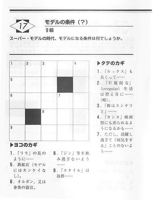 さあ、今月の問題は先月と同レベルの九級です。 今回のテーマは「BODY PARTS-1」。 タテのカギ 6ができればあなたは相当キラキラ頭脳。 すぐに分からなくても、周りから積み上げて行くと、「ああーそおか~!」と分かるしかけ。
